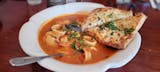 Fresh fish, black mussels, prawns, calamari, in a rich seafood tomato broth, with garlic bread.