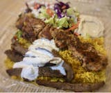 A combination of gyros meat, chicken kabob, dolmas, hummus, rice, Greek salad, and pita.